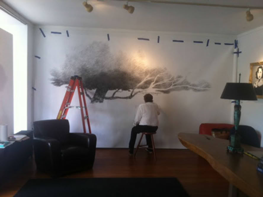 In the spirit of 'en plein air” Roland will be painting one of his grand trees directly onto our wall all day Saturday prior to the opening of his exhibit across the street at McDaris Gallery .